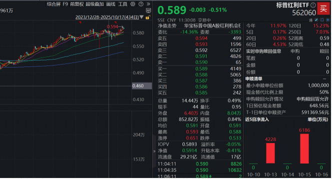 “能追牛、能扛熊”的标普A股 红利指数 领衔主流红利指数,连续两个交易日(10.15、10.16)创新高,稳稳站上5日均线,跟踪该指数的A股红利热门标的——标普红利ETF(562060)同样续创新高,10.16日盘中一度上涨至0.594元,今年以来上涨12.16%*,截至10月17日午盘收盘微跌0.51%,彰显韧性。