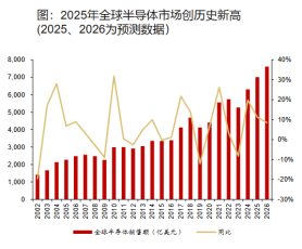 2025年全球半导体市场创历史新高。半导体行业受技术驱动和宏观周期影响,市场规模呈波动上升趋势,2004-2024年复合增速5.6%。2023年周期底部以来,行业逐步实现复苏与扩张,根据世界半导体贸易统计组织(WSTS)的数据,预计2025年全球半导体销售同比增长11%至7009亿美元创历史新高,预计2026年全球半导体销售额将同比增长9%至7607亿美元。