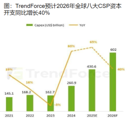 AI是半导体行业增长的核心引擎。根据SEMI预测,2020-2030年,AI相关半导体收入占比将从不足10%增长至48%,非AI半导体收入增速放缓。全球八大CSP资本开支持续增长,根据TrendForce预测,2026年全球八大CSP(谷歌、 亚马逊 、 微软 、 甲骨文 、腾讯、阿里、字节、百度)资本开支将同比增长40%至6000亿美元。