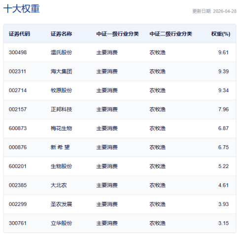 养殖ETF(159865)提供高效的一篮子配置工具。 该ETF跟踪 中证全指 畜牧养殖指数,覆盖34只养殖核心标的,前十大权重股以 牧原股份 、 温氏股份 等规模化龙头为主。在本轮周期逻辑下,以市值权重为核心的指数设计天然契合产业趋势,兼具头部企业的稳健性与周期反转的弹性。
