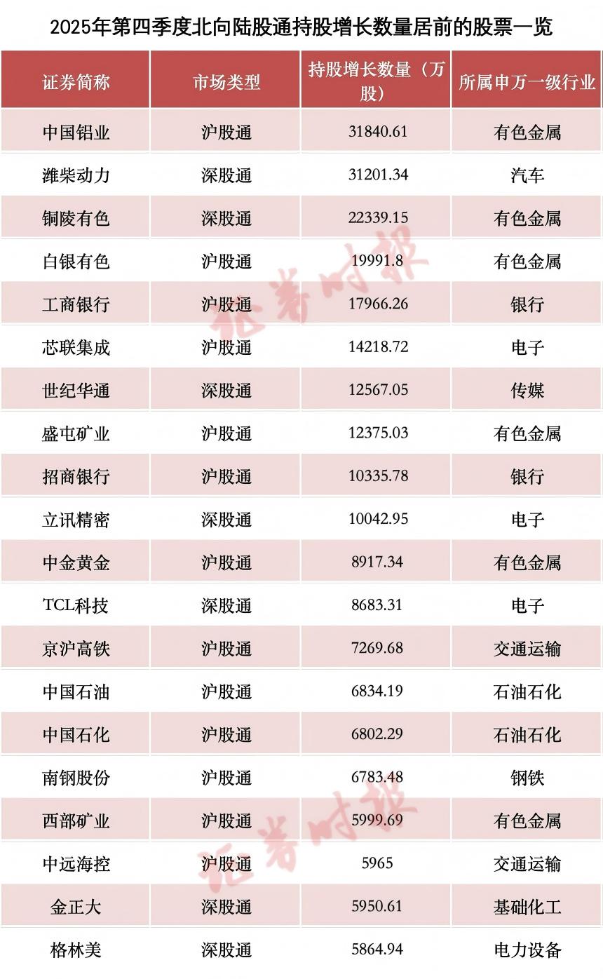 根据 香港交易所 网站披露的资料,北向陆股通(含 沪股通 和深股通,下同)2025年第四季度末的持股数据正式披露,北向陆股通资金在2025年第四季度的持股动向也初步浮出水面。