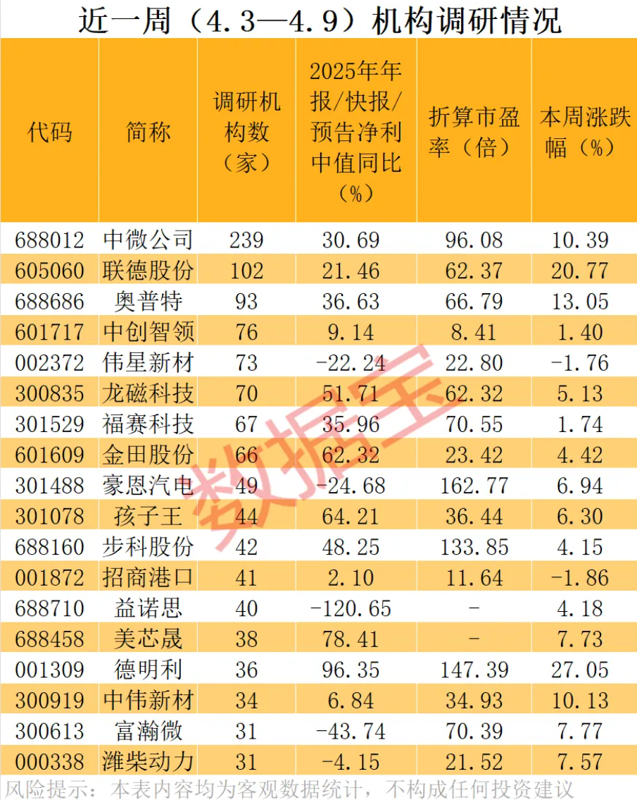 近一周(4月3日至9日),获机构调研的个股有210多只, 中微公司 调研机构数最多。