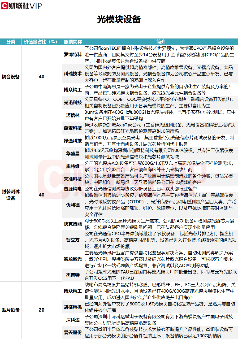 据梳理,光模块设备主要分为三大类,包括价值量占比40%的耦合设备、价值量占比40%的封装测试设备以及价值量占比20%的贴片设备。耦合设备涉及的A股上市公司包括 罗博特科 、科瑞技术、 博众精工 、 光迅科技 ;封装测试设备涉及的公司包括 迈信林 、 燕麦科技 、 绿通科技 、华盛昌、 奥特维 、 天准科技 、 普源精电 、 优利德 、快克智能、 智立方 、 德龙激光 、 杰普特 。具体情况详见下图:
