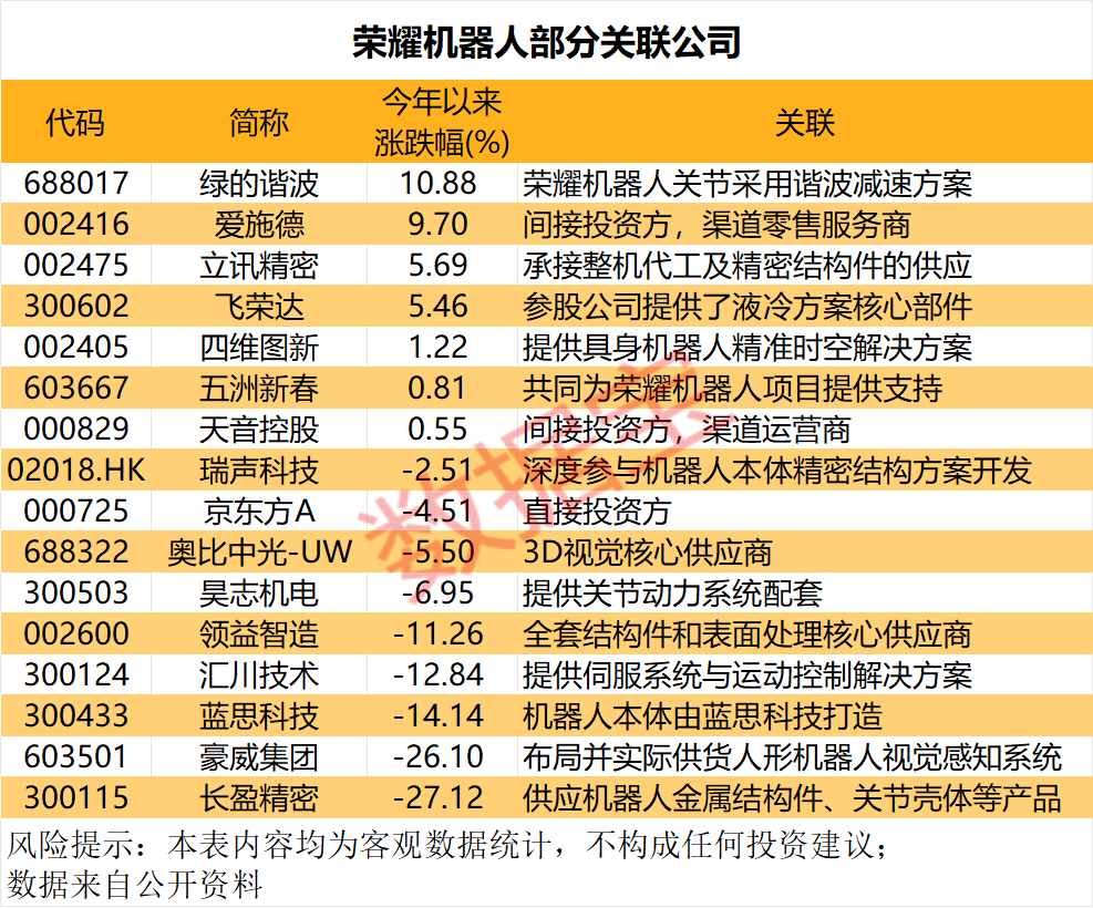 从A股相关个股来看, 京东方A 直接持有荣耀股权近0.62%, 爱施德 、 天音控股 通过星盟信息间接参股荣耀。