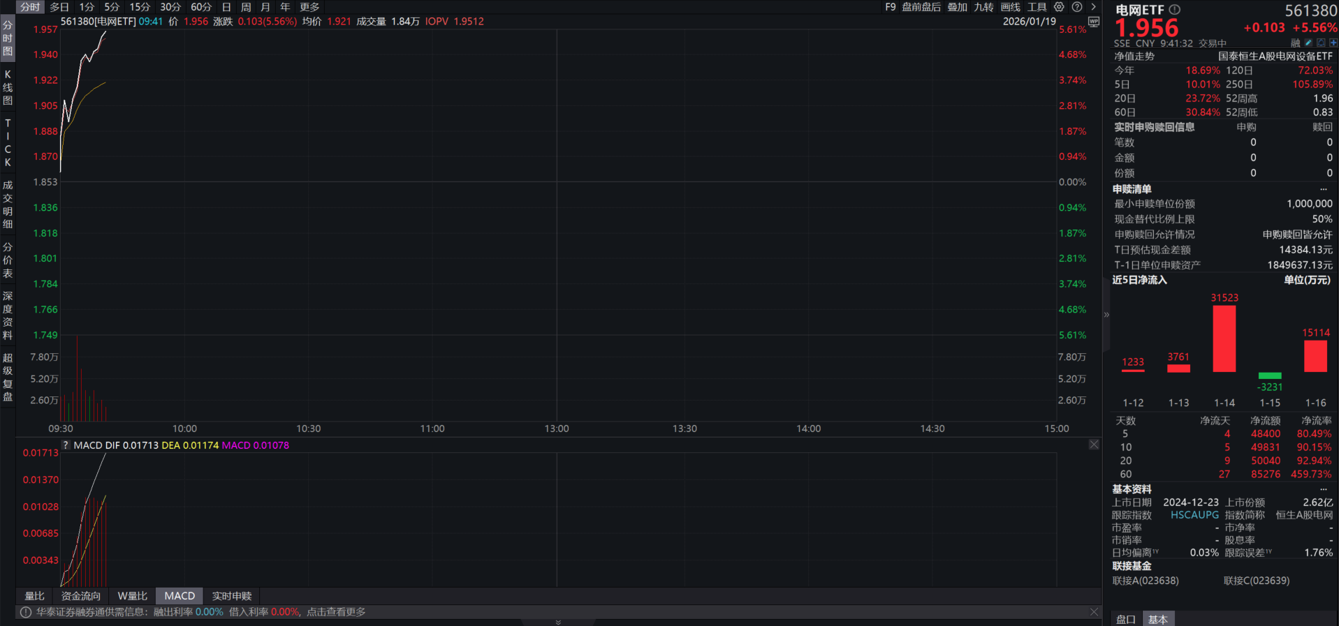 电网ETF(561380)开盘大涨超5%,资金抢筹布局,近5日净流入超5亿元。