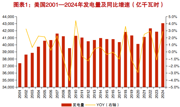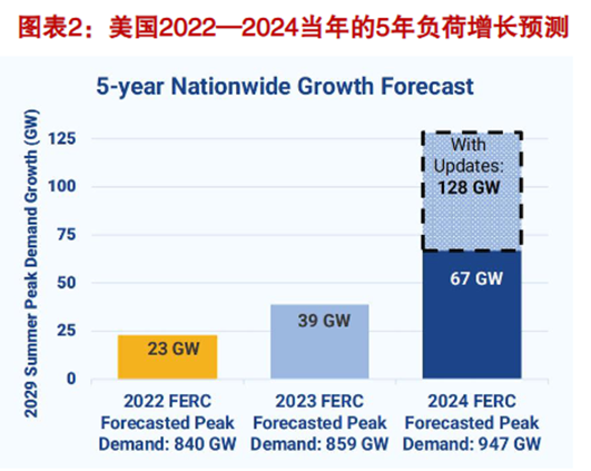 海外方面, 美国电力 需求增长长期处于停滞状态。负荷角度看,到2030年用电负荷有望接近1000GW。美国2022—2024年最高用电负荷大约在820GW上下,也就是说,仅OpenAI一家算力中心的新增负荷250GW,就超过美国当前全国最高用电负荷的1/4。根据Grid Strategies的预测,到2029年美国将比2024年新增约128GW最高用电负荷,达到947GW,新增的128GW中,数据中心贡献约90GW,制造业等其他贡献约38GW。