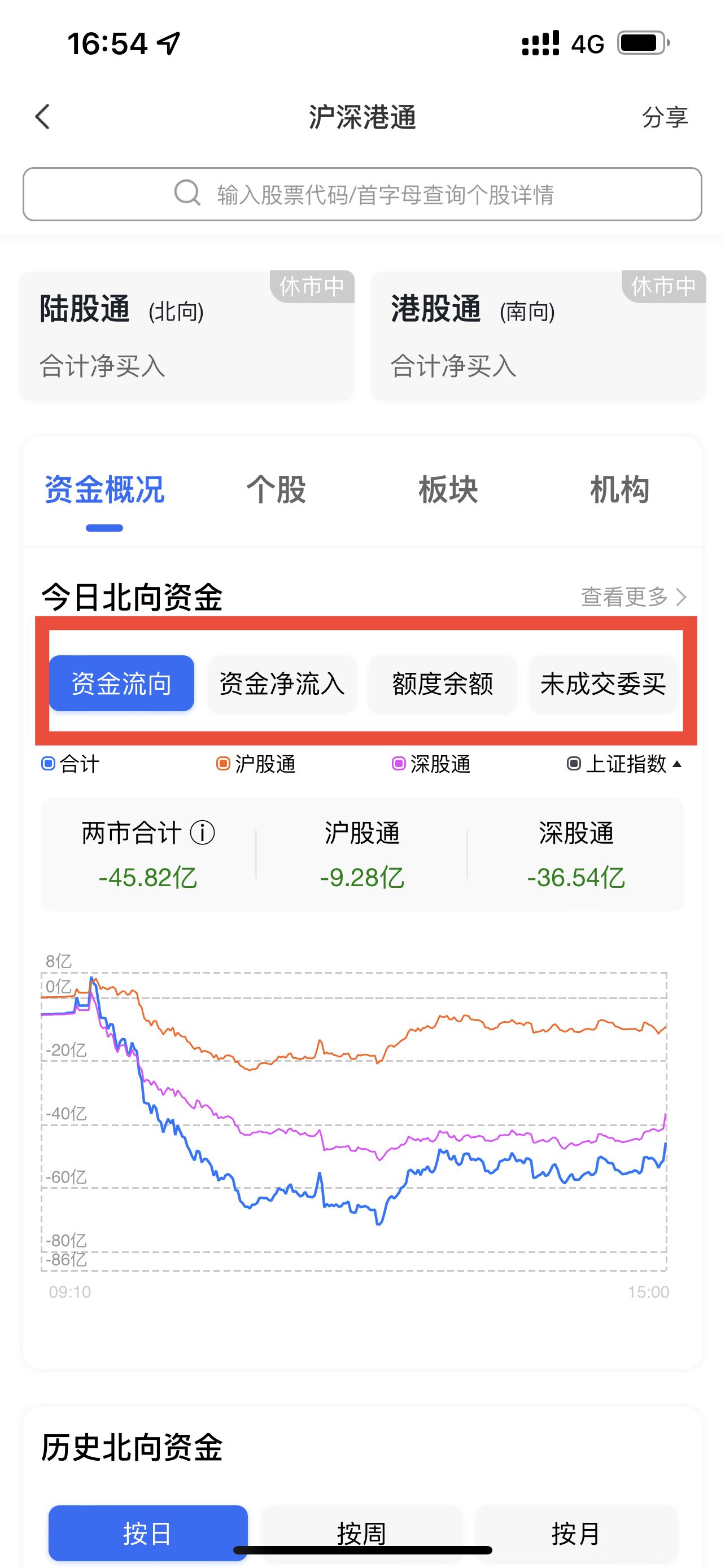 2)改版前北上资金功能页展示,包括四个模块,资金流向、资金净流入、额度余额、未成交委买。