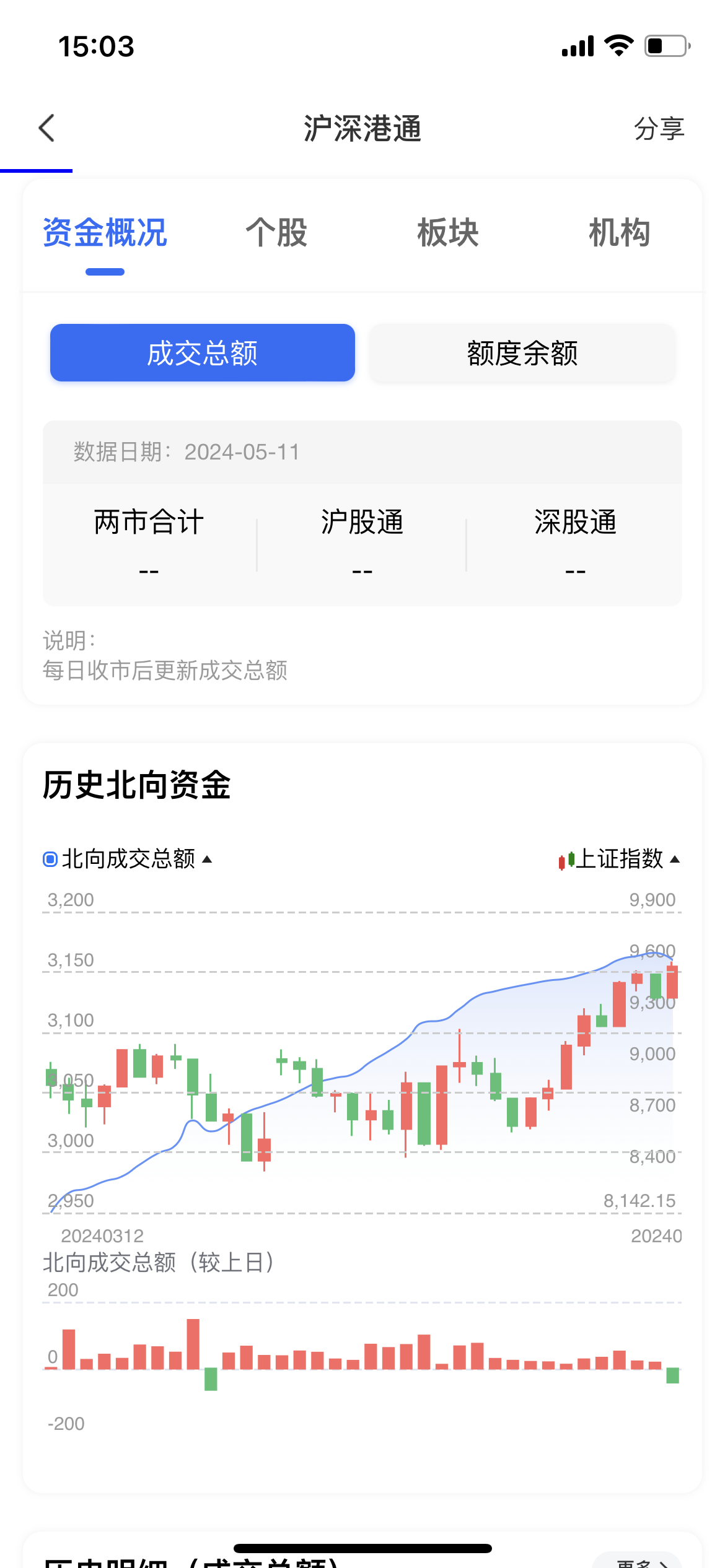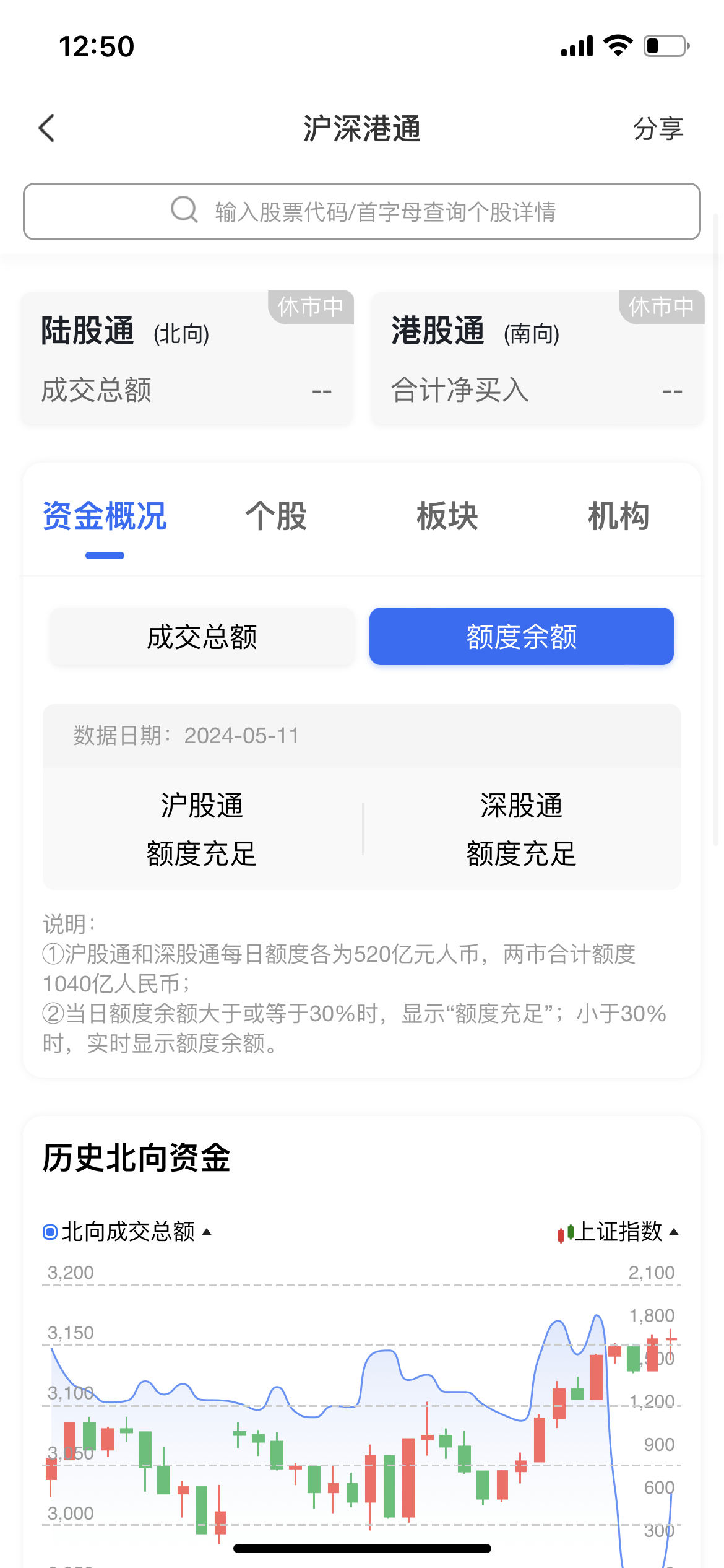 3)改版后北上资金功能页展示,包括成交总额和额度余额两个模块: