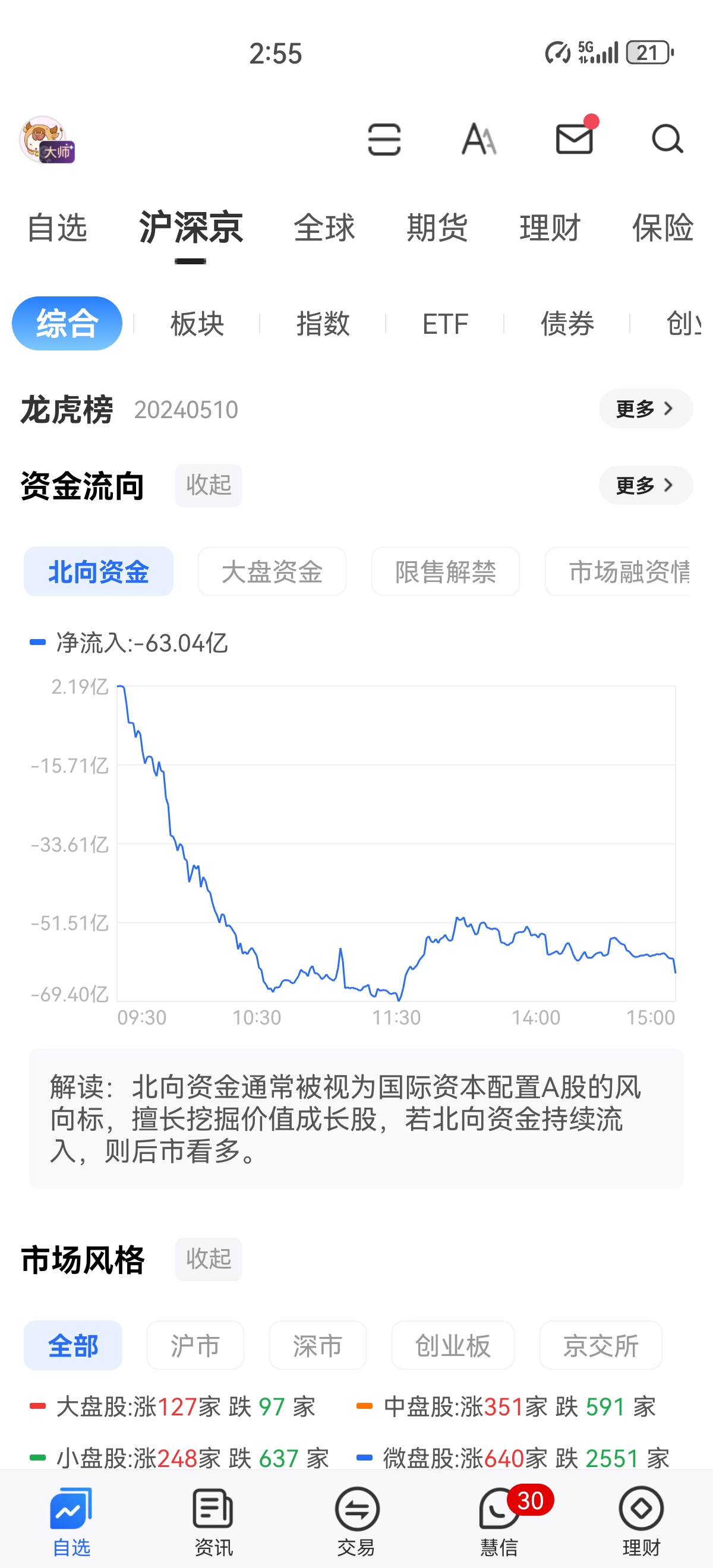 4)改版后的沪深京--综合--资金流向,其中的北向资金功能将不再展示。