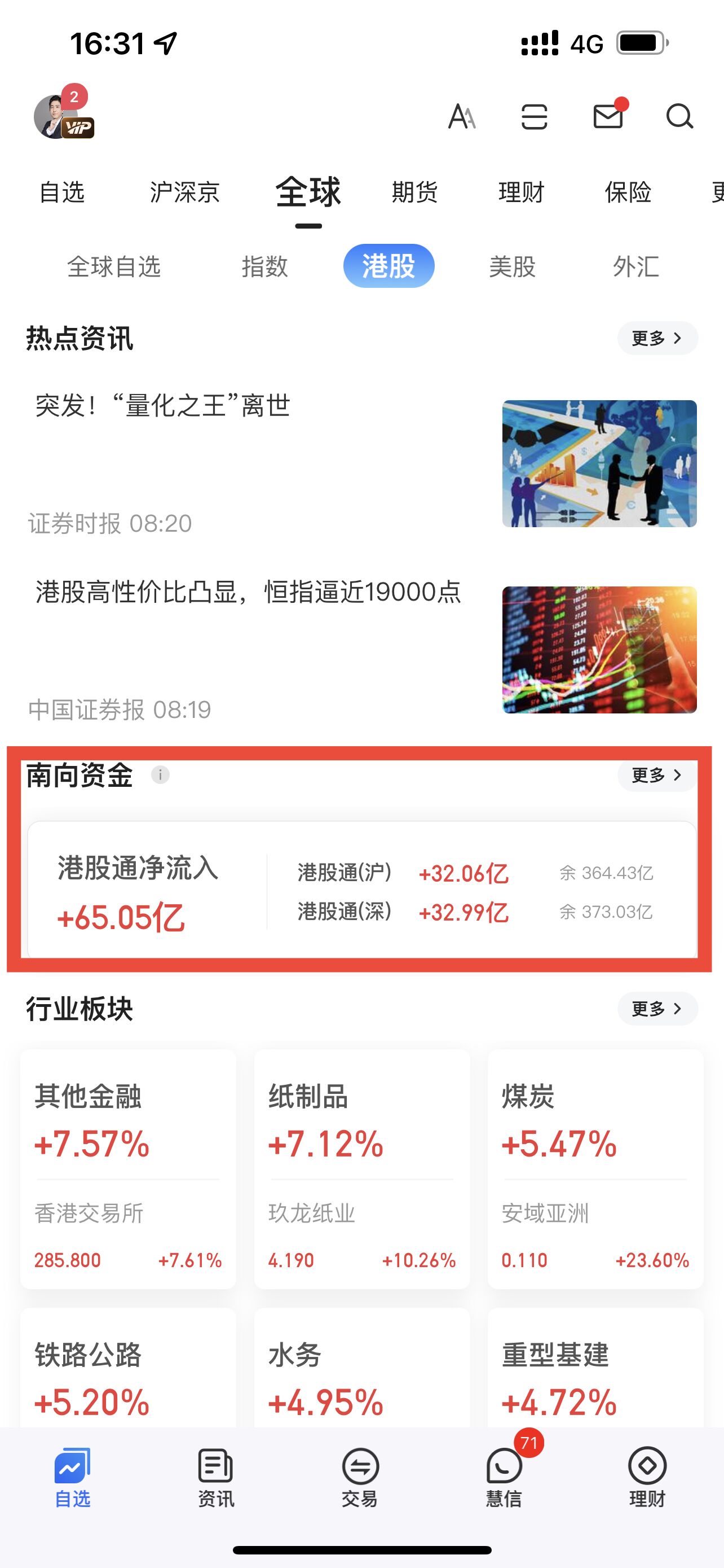 在该功能页面下,北向资金不再做展示,仅保留南向资金,用户可点击右侧【更多】按钮查询细分数据: