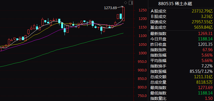 市场热点方面,有色金属概念再度全线走强, 稀土永磁 方向领涨,板块指数单边上扬,放量大涨5.66%,创历史新高。 九菱科技 一度冲击30%涨停, 银河磁体 、 新莱福 、 惠城环保 等多股20%涨停, 包钢股份 、 北方稀土 、 中国稀土 等逾20只个股涨停或涨超10%。