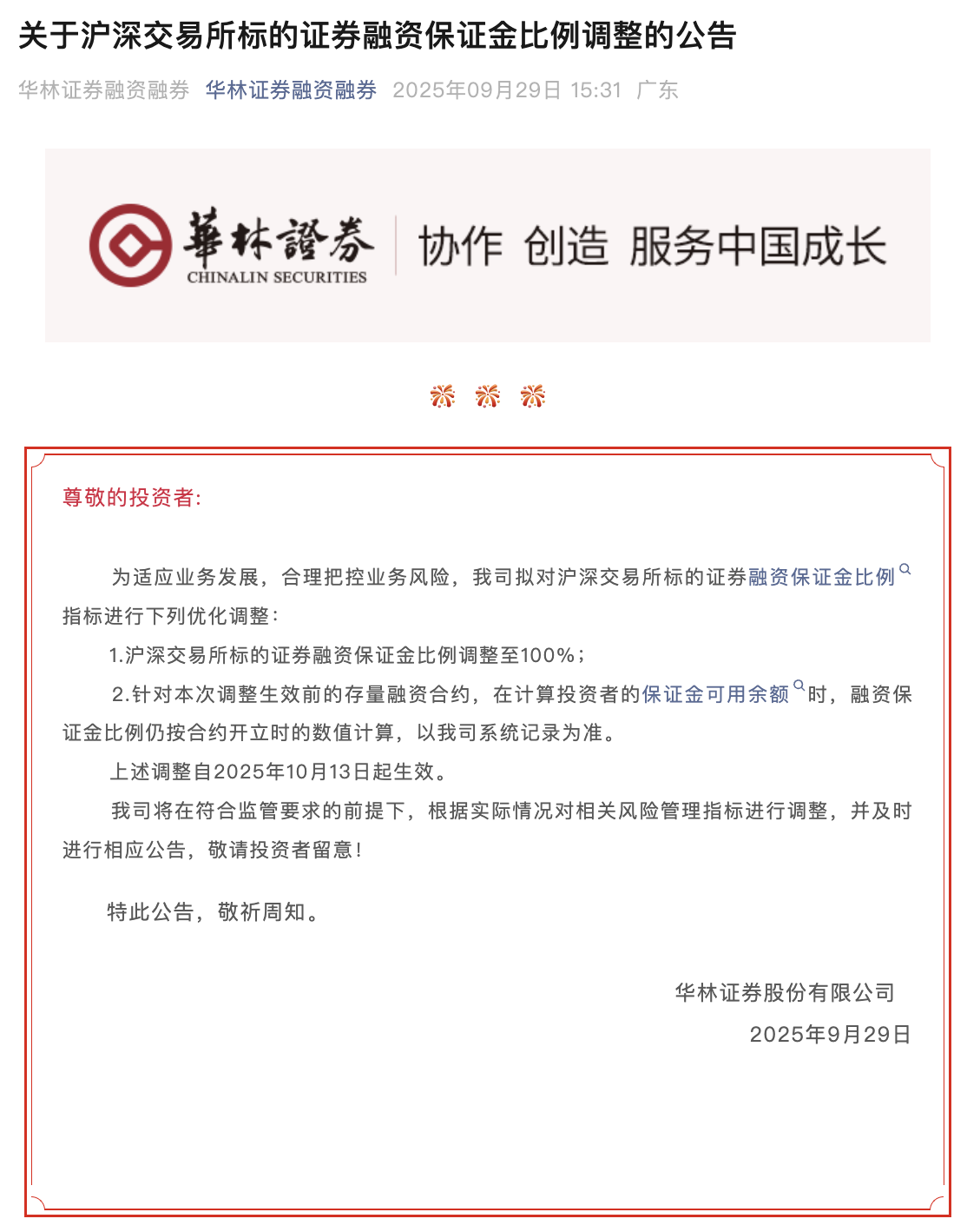 华林证券 宣布自2025年10月13日起,将沪深交易所标的证券融资保证金比例调整至100%,旨在适应业务发展并合理把控风险,存量融资合约则仍按原比例计算。