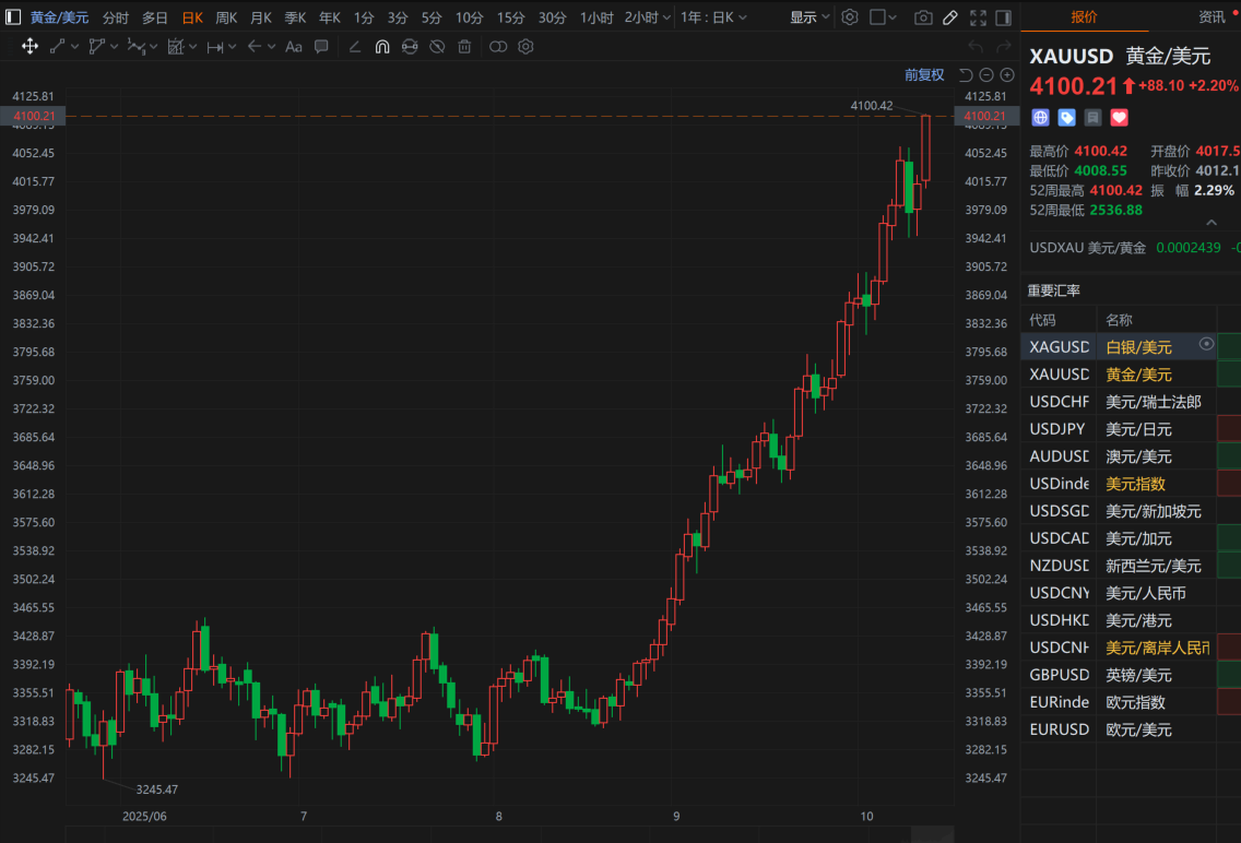 现货黄金站上4100美元/盎司关口,再创历史新高,日内涨超90美元,涨幅超2%,年内涨近1500美元,涨幅超56%