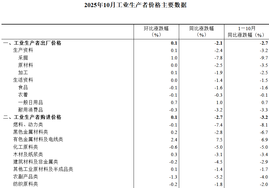 2025年10月份,全国工业生产者出厂价格同比下降2.1%,降幅比上月收窄0.2个百分点;环比由上月持平转为上涨0.1%。工业生产者购进价格同比下降2.7%,降幅比上月收窄0.4个百分点;环比上涨0.1%,涨幅与上月相同。1—10月平均,工业生产者出厂价格比上年同期下降2.7%,工业生产者购进价格下降3.2%。
