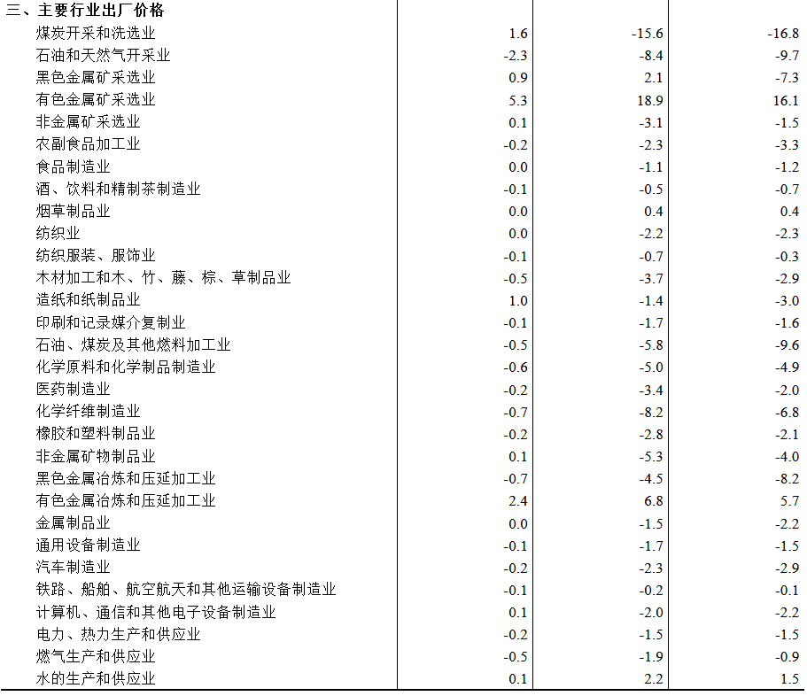 工业生产者购进价格中,燃料动力类价格下降7.4%,农副产品类价格下降5.2%,化工原料类价格下降5.0%,建筑材料及非金属类价格下降4.5%, 黑色金属 材料类价格下降2.8%,纺织原料类价格下降1.8%; 有色金属 材料及电线类价格上涨7.5%。