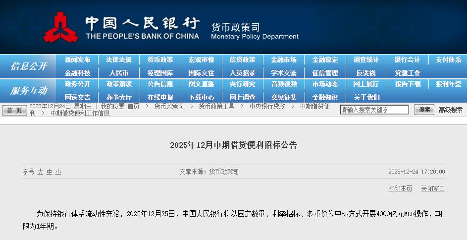 为保持银行体系流动性充裕,2025年12月25日,中国人民银行将以固定数量、利率招标、多重价位中标方式开展4000亿元MLF操作,期限为1年期。