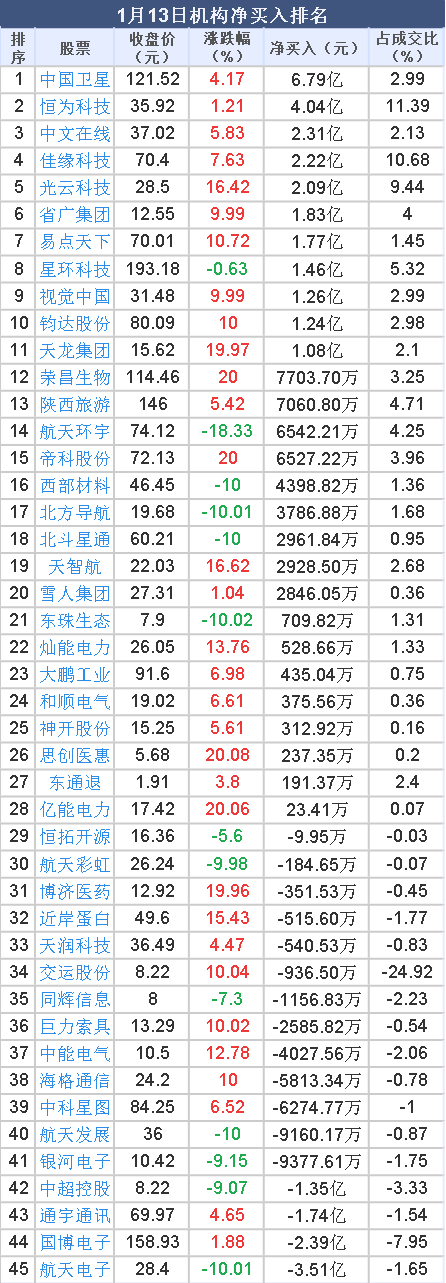 2026年1月13日,大智慧数据中心显示,龙虎榜中机构净买入17.75亿元。其中,净买入的个股28只,机构净买入较多个股分别是 中国卫星 、 恒为科技 、 中文在线 等,净买入金额占当日成交额比例达2.99%、11.39%、2.13%。