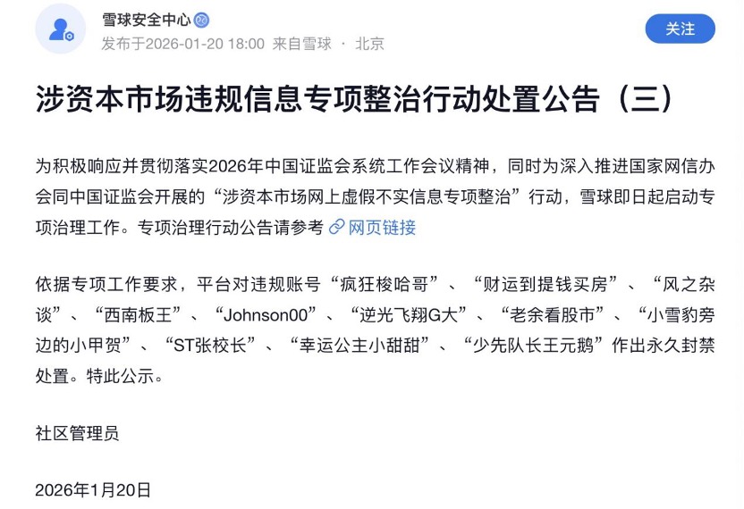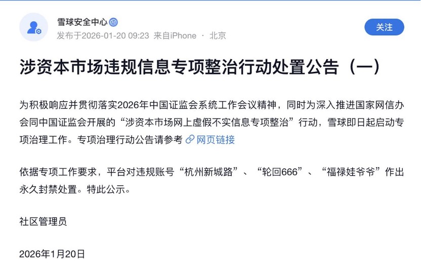 1月20日,雪球安全中心一天之内发布了三则涉资本市场违规信息专项整治行动处置公告称,为深入推进国家网信办会同证监会开展的“涉资本市场网上虚假不实信息专项整治”行动,雪球即日起启动专项治理工作。