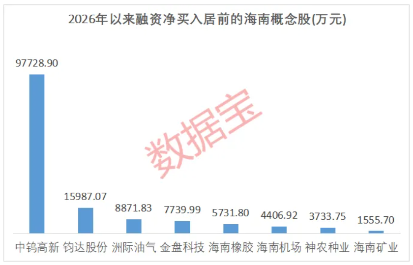 证券时报·数据宝梳理了2026年以来(截至1月28日),融资客净买入居前的海南概念股,金额在1000万元以上的个股共计8只。其中, 中钨高新 、 钧达股份 净买入额分别为9.77亿元、1.6亿元; 洲际油气 、 金盘科技 、 海南橡胶 净买入额均在5000万元以上。