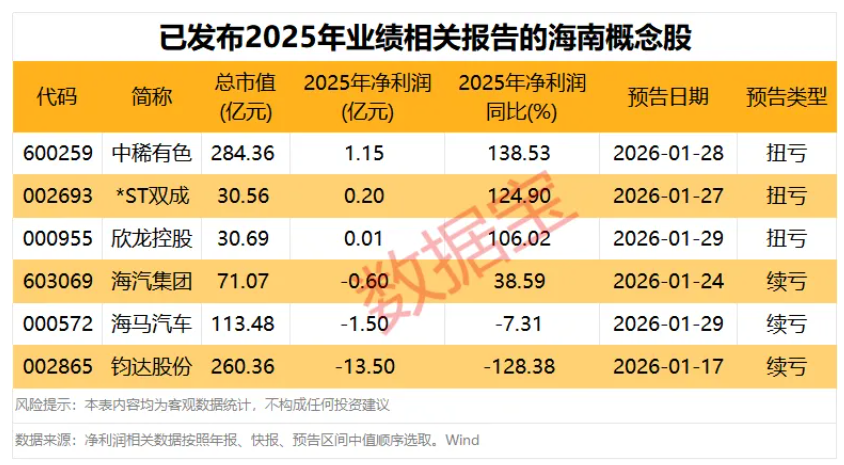 截至1月29日,6只海南概念股已发布2025年业绩相关报告。 中稀有色 、 *ST双成 、 欣龙控股 3股预计扭亏; 海汽集团 、 海马汽车 、钧达股份3股预计续亏。
