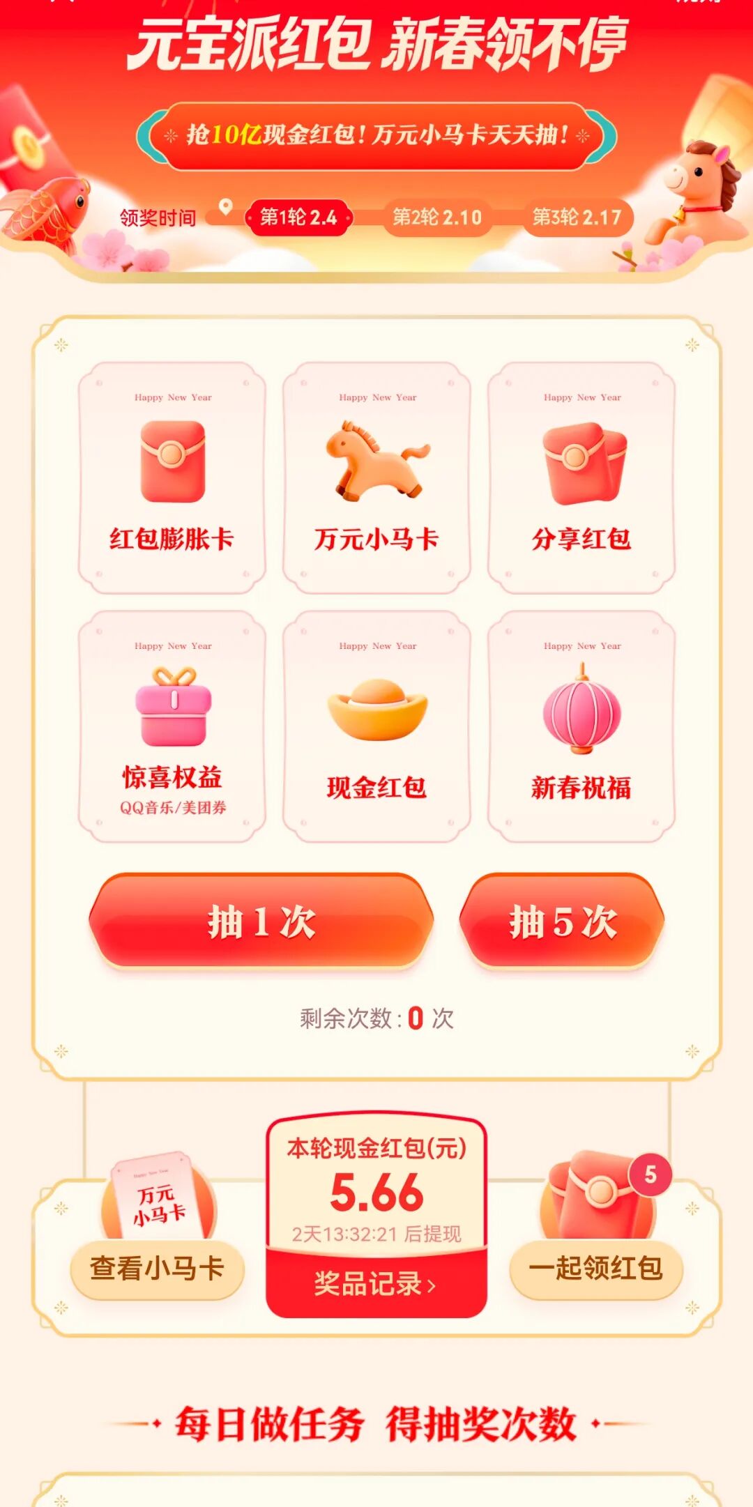 在主会场,用户每日可获5次基础抽奖机会,并通过完成任务额外增加40次以上机会。红包金额采用逐轮累积机制,配合最高5倍的“膨胀卡”,最终可在指定提现日将累计金额乘以膨胀倍数直接提现至微信零钱。限量100张的“万元小马卡”每张配有专属设计,中奖用户可在2月17日统一提现。此外,分享红包至微信、QQ等平台还可获得额外奖励,进一步激活社交裂变。