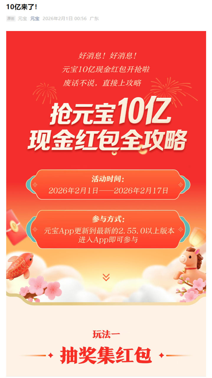 2月1日凌晨,元宝微信公众号发文称,10亿现金红包开抢。时间持续到2月17日。