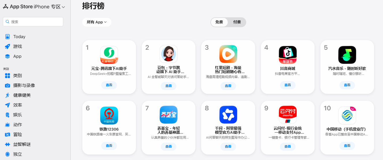 目前,免费榜前10中有3个是AI助手,除元宝和豆包外,阿里千问位列第八。