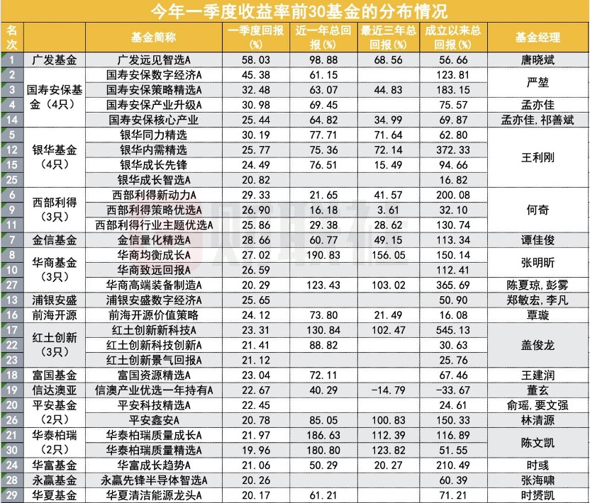 老牌权益大厂银华基金今年一季度收成同样不错,银华同力精选(第5名)、银华内需精选(第12名)、银华成长先锋(第15名)以及银华成长智造(第25名)4只产品跻身前三十,均为王利刚一人管理。