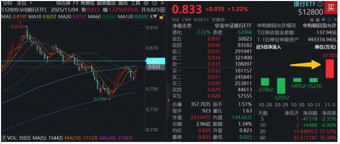 值得一提的是,银行ETF(512800)资金面出现拐点信号。上交所数据显示,512800昨日获资金大举净流入6.78亿元,扭转了此前连续流出的态势。