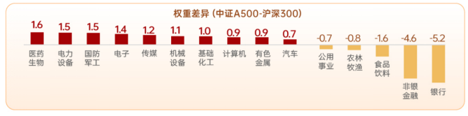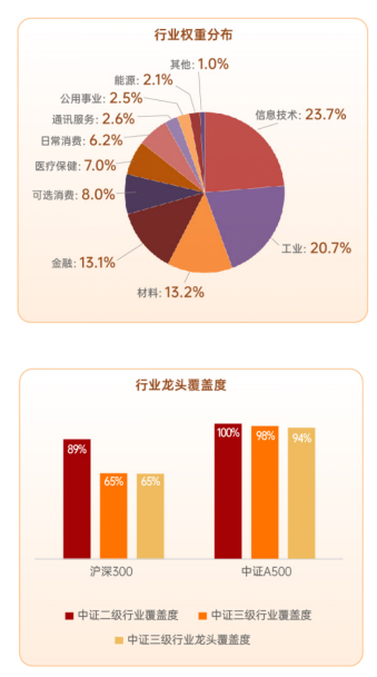 行业分布方面,包括约50%传统价值行业+约50%新兴成长行业。相较于 沪深300 ,中证A500减少了传统行业的分布,纳入了更多电力设备、 医药生物 、电子、计算机等新兴领域龙头。既能把握科技股的上涨弹性,又能拥有传统价值行业抵御风险的能力。