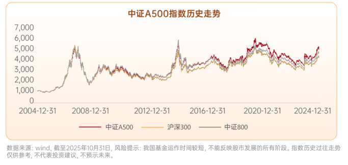 历史业绩来看,中证A500指数历史走势占优。截至2025年10月31日,中证A500指数基日以来涨幅高达458.37%,而同期沪深300, 中证800 指数收益率为362.22%,409.30%,超额分别为96.15%、49.07%。
