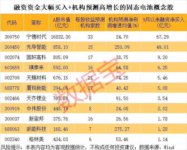 从未来增长潜力来看,根据5家以上机构一致预测,今明两年净利润增速均超20%的固态电池概念股有16只。这16股中,部分股票近期获得融资资金大手笔加仓。数据宝统计,截至10月9日收盘,9月以来融资净买入超1亿元的有11只, 宁德时代 、先导智能、国轩高科、 璞泰来 、 天赐材料 等融资净买入额居前。