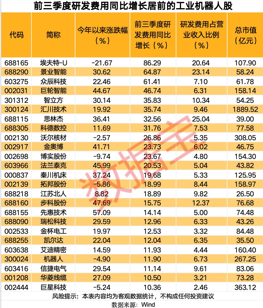 从研发费用同比增幅来看,12只概念股今年前三季度研发费用同比增幅 20%以上,持续加大研发投入力度。 埃夫特 -U、景业智能、 众辰科技 同比增幅居前,分别为86.29%、64.87%、61.41%。