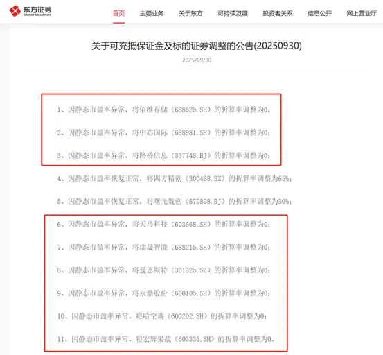 券商中国记者注意到,除了东方财富证券,东方证券和国融证券也在9月30日官网发布了类似的公告,因静态市盈率异常,将中芯国际、佰维存储、 天马科技 、 瑞晟智能 科技、 曼恩斯特 、 宏辉果蔬 、 永鼎股份 、路桥信息、 哈空调 的折算率均调整为0,上述调整自10月9日正式生效。