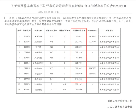 9月30日,国融证券详细披露了9只股票市盈率触及“红线”情况,中芯国际、佰维存储、天马科技、瑞晟智能科技、曼恩斯特、宏辉果蔬、永鼎股份、路桥信息以及哈空调9只股票静态市盈率均高于300倍,其中,最高的为路桥信息,静态市盈率达到了947倍。