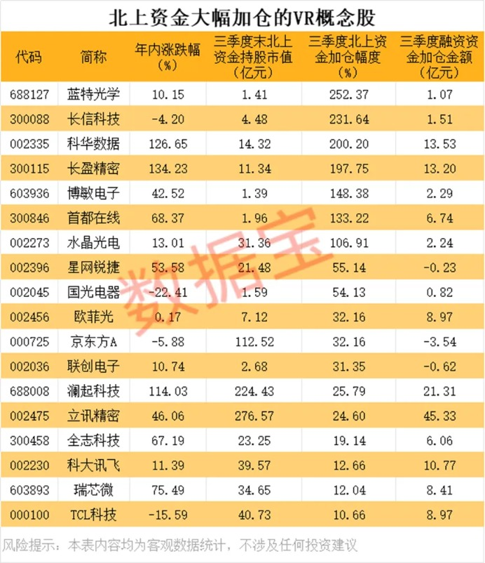 从资金角度看,北上资金三季度末持股市值超1亿元的VR概念股中,有18股在三季度获加仓幅度均超10%。 蓝特光学 、 长信科技 、科华数据、长盈精密、 博敏电子 、 首都在线 、 水晶光电 7只个股的北上资金三季度持仓翻倍。