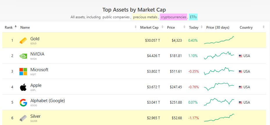 多位贵金属市场专业人士在周四注意到,根据CompaniesMarketCap的数据显示,随着金价屡创历史新高,黄金目前的总市值已突破了30万亿美元,在全球资产市值排行榜上断层领先。