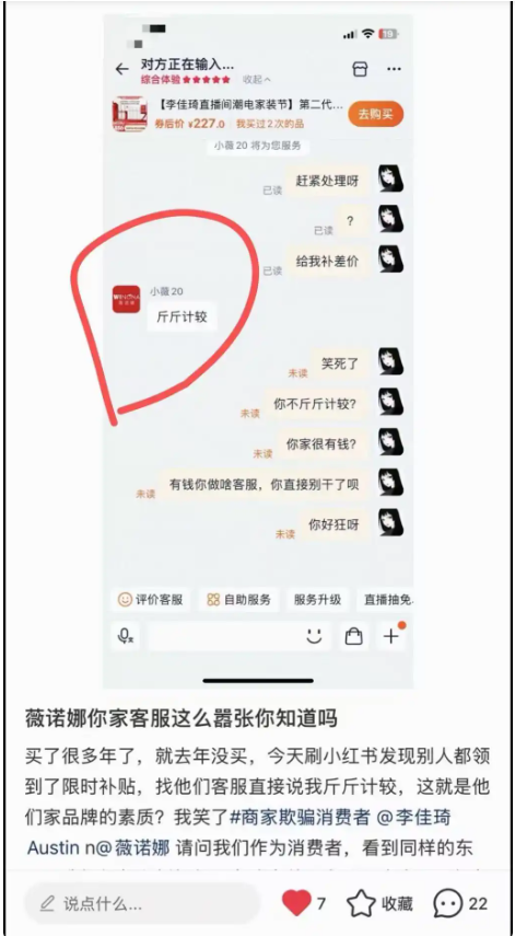 “为什么平台说是商家(行为)?甩锅呗,让直播间和商家背锅呗。”李佳琦也在直播时声称,这是平台的行为,发放了一千多单,“其他一些品牌也有限时补贴”。他还表示,网友们可以根据实付金额选择留或退,“谁的问题就找谁”。