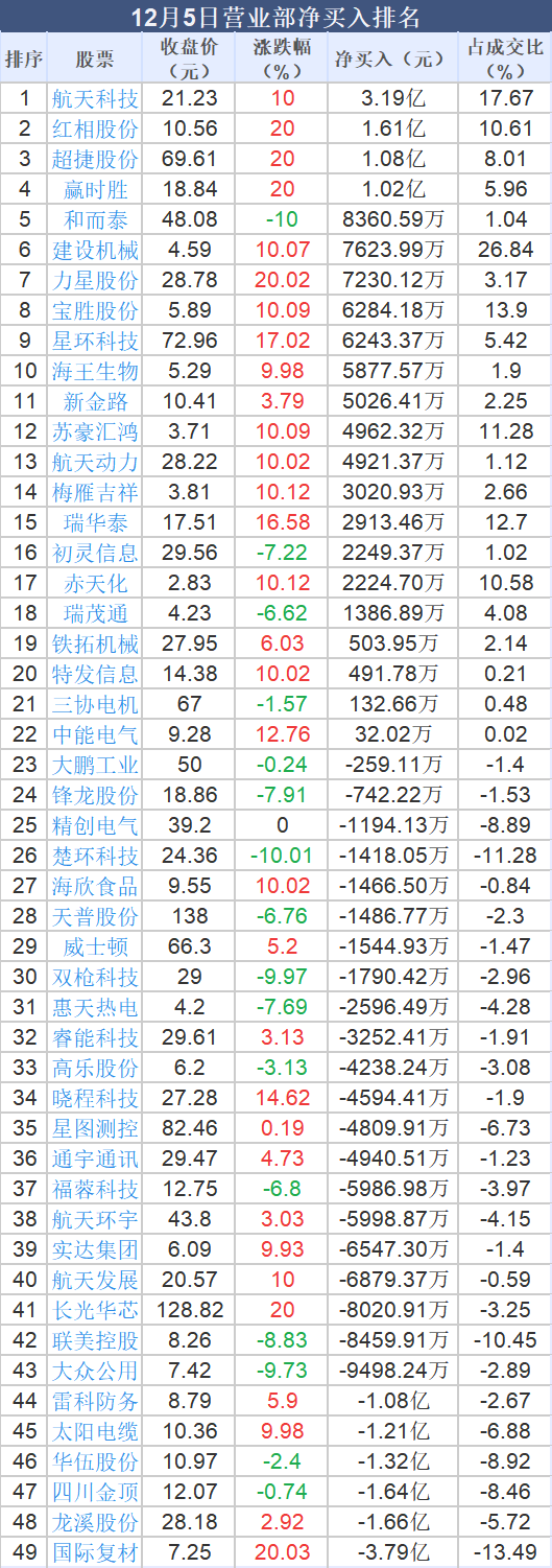 12月5日, 大智慧 数据中心显示,龙虎榜中营业部净卖出5.42亿元。其中,净买入的个股22只,营业部净买入较多个股分别是 航天科技 、 红相股份 、 超捷股份 等,净买入金额占当日成交额比例达17.67%、10.61%、8.01%。