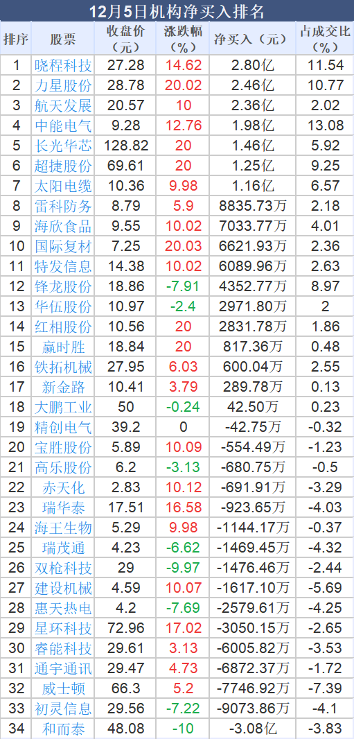 龙虎榜中机构净买入10.03亿元。其中,净买入的个股18只,机构净买入较多个股分别是 晓程科技 、 力星股份 、 航天发展 等,净买入金额占当日成交额比例达11.54%、10.77%、2.02%。