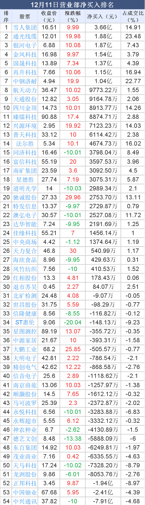 2025年12月11日, 大智慧 数据中心显示,龙虎榜中营业部净买入3.40亿元。其中,净买入的个股30只,营业部净买入较多个股分别是 雪人集团 、 通光线缆 、 银河电子 等,净买入金额占当日成交额比例达14.91%、23.48%、7.43%。