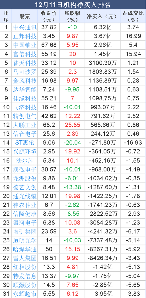 2025年12月11日,大智慧数据中心显示,龙虎榜中机构净买入1.36亿元。其中,净买入的个股13只,机构净买入较多个股分别是中兴通讯、正邦科技、中国铀业等,净买入金额占当日成交额比例达3.74%、16.99%、5.40%。