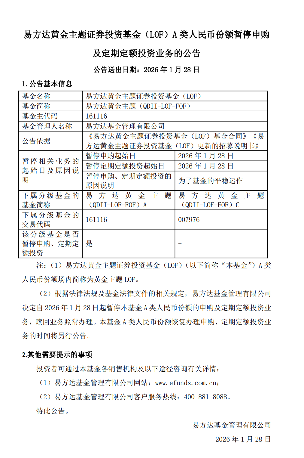 易方达黄金主题LOF1月27日公告,1月28日起暂停A类人民币份额申购及定期定额投资业务。