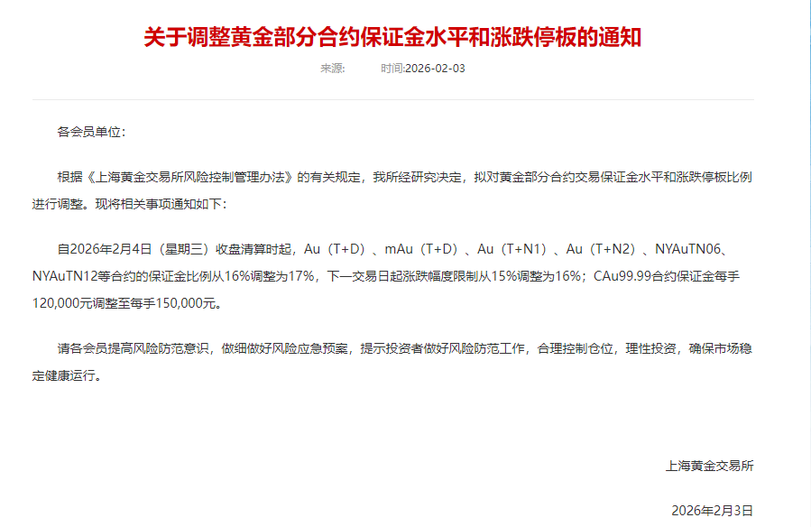 自2026年2月4日(星期三)收盘清算时起,Au(T+D)、mAu(T+D)、Au(T+N1)、Au(T+N2)、NYAuTN06、NYAuTN12等合约的保证金比例从16%调整为17%,下一交易日起涨跌幅度限制从15%调整为16%;CAu99.99合约保证金每手120000元调整至每手150000元。