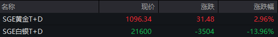 国内市场方面,SGE黄金T+D今日收涨2.96%,SGE白银T+D今日收跌13.96%。