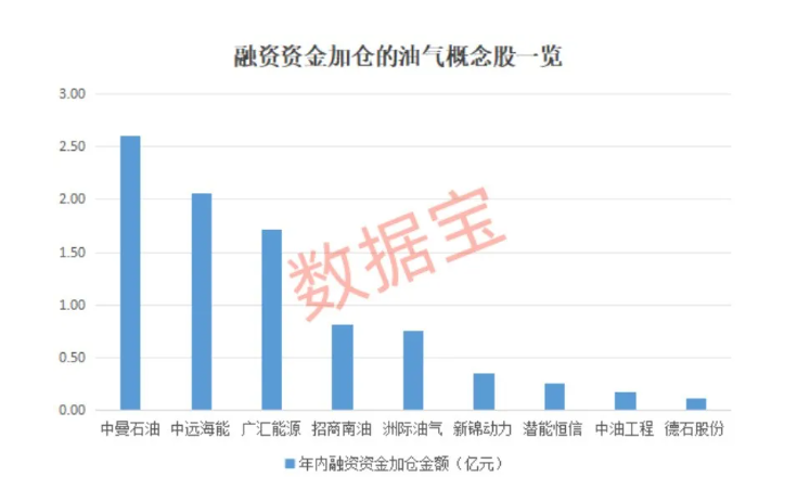 从资金加仓来看,年内9只油气开采概念股获融资资金加仓,中曼石油、 中远海能 、 广汇能源 加仓金额最高,分别为2.61亿元、2.05亿元、1.71亿元, 招商南油 、洲际油气、 新锦动力 加仓金额均在3000万元以上。
