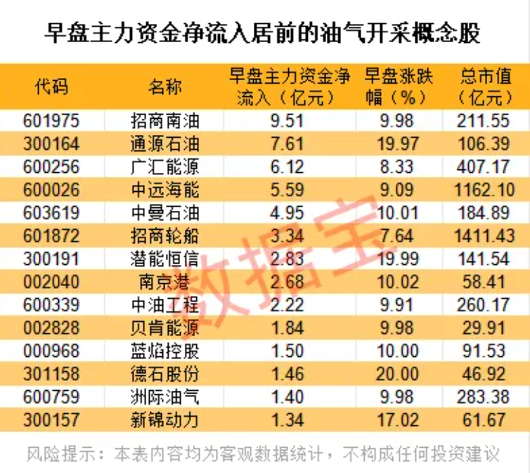 早盘,主力资金大幅流入油气开采板块,板块合计净流入资金超55亿元。其中,招商南油主力资金净流入9.51亿元,排名第一;通源石油净流入超7亿元,广汇能源净流入超6亿元,中远海能、中曼石油净流入超4亿元。