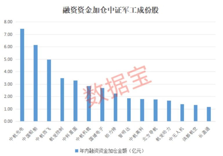 数据宝以中证军工指数成份股为统计范围,今年以来,有15只概念股获融资资金加仓超1亿元, 中航光电 、 中国船舶 、 中航西飞 、 航发控制 、 中科星图 加仓金额均在3亿元以上。