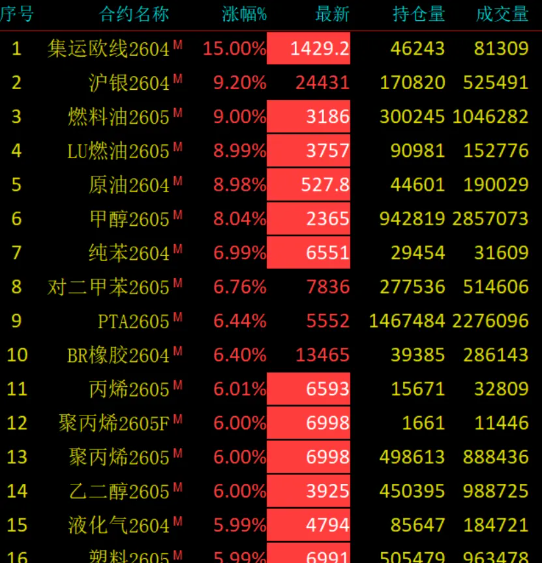 截至当日下午收盘,集运指数(欧线)、原油、高硫燃料油、低硫燃料油、甲醇、液化气、丙烯、聚丙烯、塑料、乙二醇、纯苯等12个品种涨停。此外,黄金、白银等品种也出现大涨。