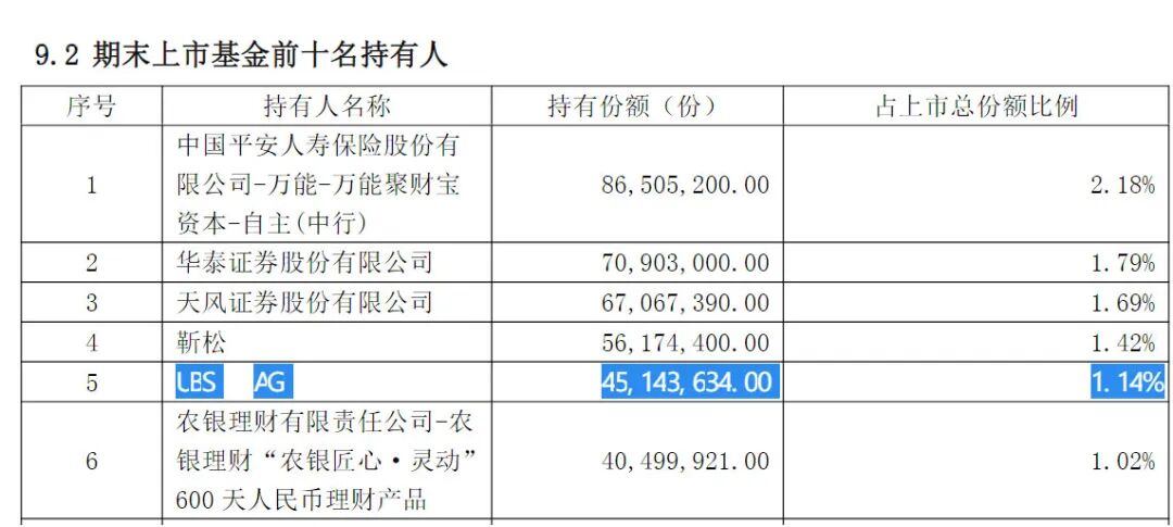 以永赢国证商用卫星ETF为例,2025年6月底,该ETF前十名持有人名单中并未出现瑞银集团,同时第10大持有人持有75万份。2025年底,瑞银集团持有永赢国证商用卫星ETF4514.36万份。